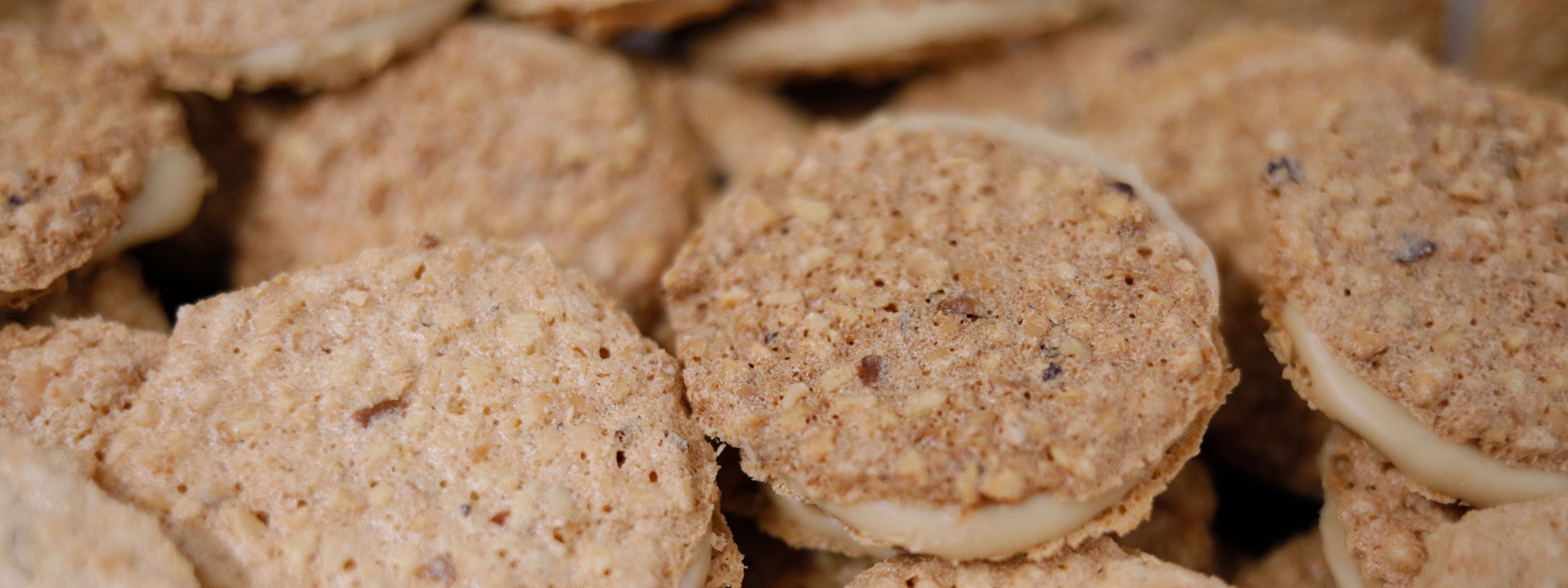 Lightly caramelized, crunchy almond meringue filled with gently conched almond nougat and covered with a bitter dark chocolate (at least 63 percent).