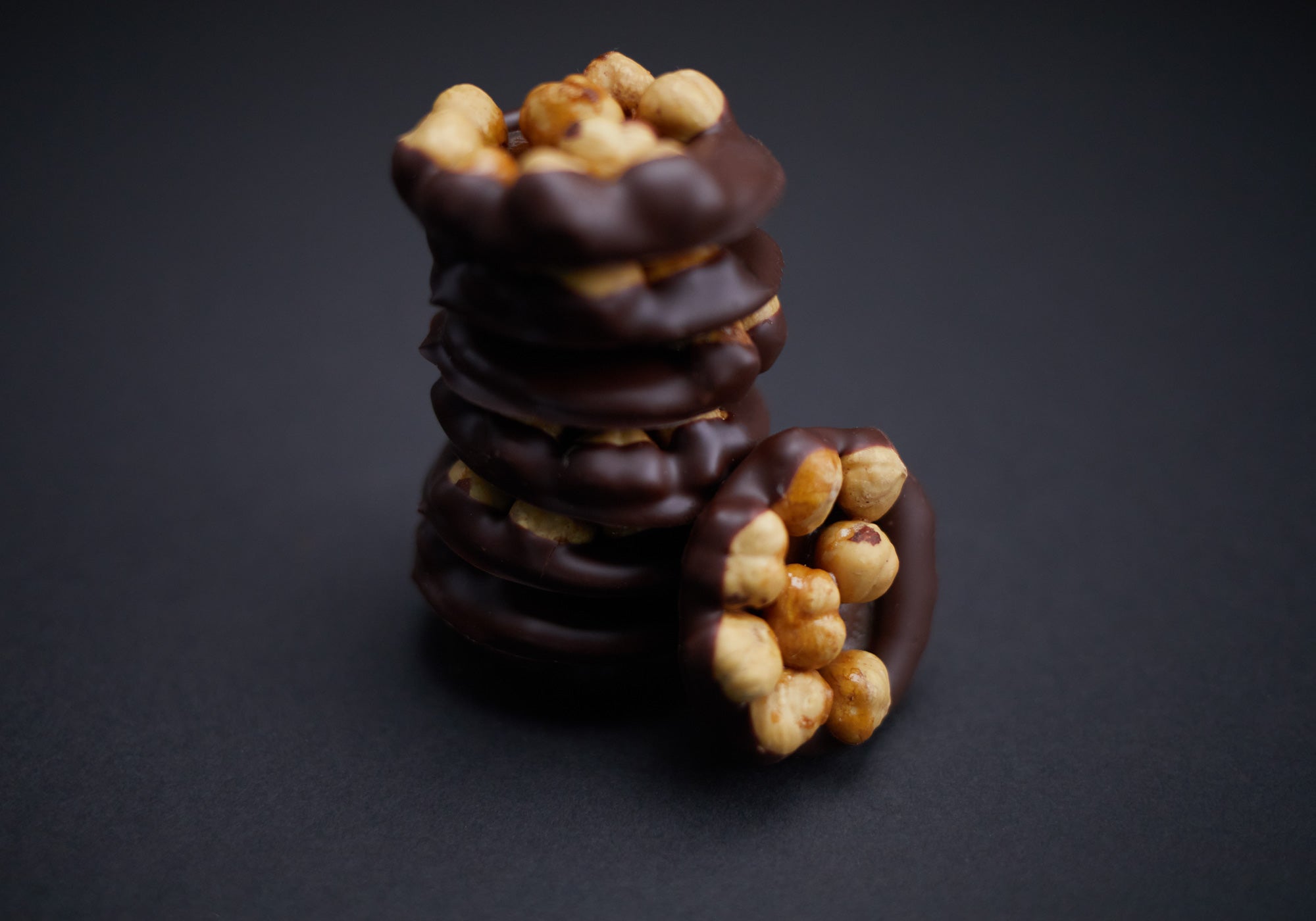 Sanft geröstete Piemonteser Haselnüsse, gebettet auf goldenen Honigkrokant und umhüllt von edler Valrhona-Zartbitterschokolade mit mindestens 62 % Kakaoanteil – unser Nussknacker Zartbitter ist ein Gebäck wie aus einer anderen Zeit. 🍫🌰